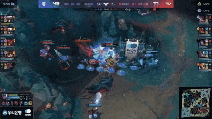 比赛第27分钟,下路团战NS击杀T1双C,随后NS一波结束比赛。