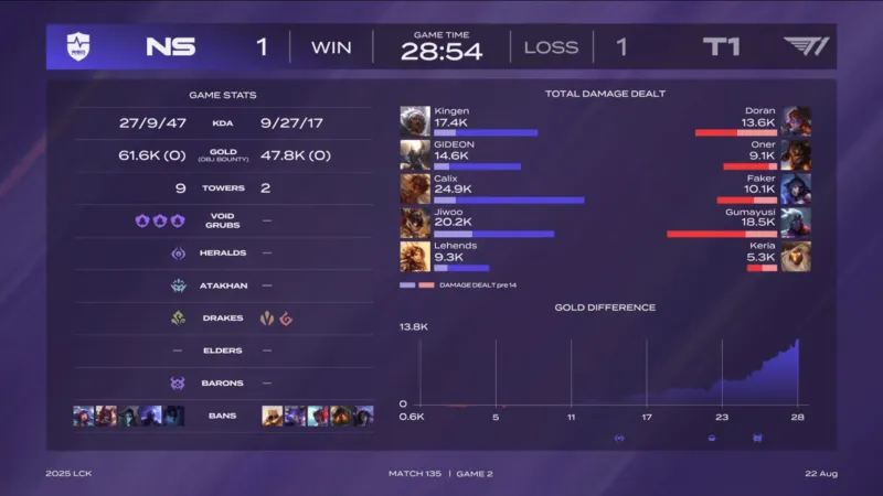 虎扑08月22日讯 【GAME2】NS蓝色方、T1红色方