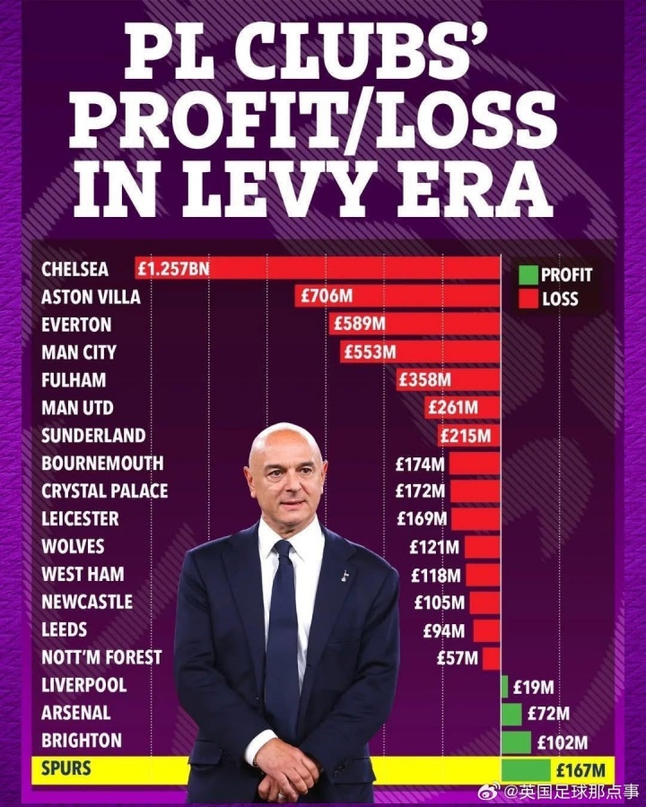 【财务表现榜首】英超俱乐部列维时期盈亏排行:热刺以1.67亿英镑利润领跑英超!💰